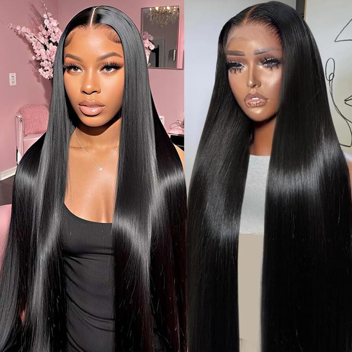 MJHAIR 13x4 28 pulgadas recto negro Natural transparente encaje frontal pelucas de cabello humano para mujeres negras